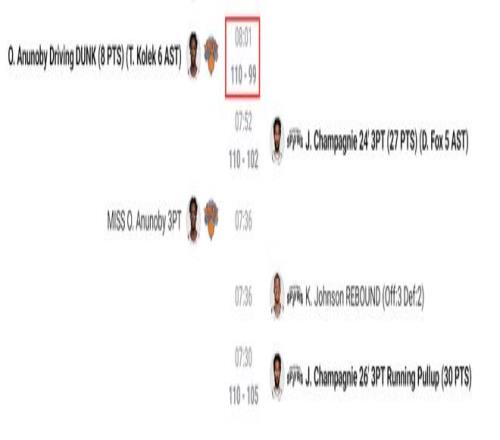 终场前8分01秒阿奴诺比暴扣后尼克斯已经领先11分,随后尚帕尼进入了Zone的状态,7分52秒尚帕尼命中三分,7分30秒再进三分,5分02秒第三个三分,4分34秒第四个三分球,从这里开始两队已经打成116-116,尚帕尼这四个三分太关键了。