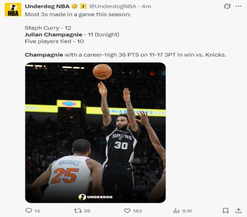 7.尚帕尼单场11个三分球在本赛季排名第二,仅次于库里12个;